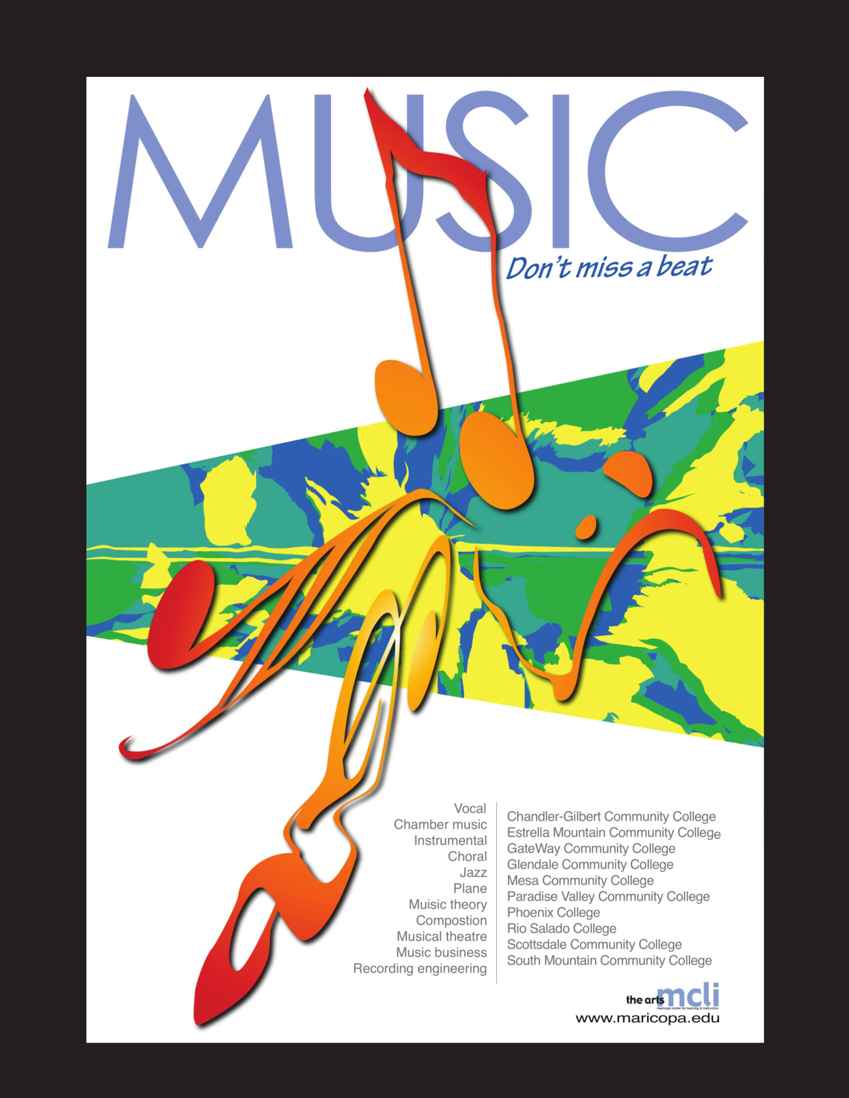 Music has a rhythm that moves usâand I wanted that same rhythm to move through this design. For this project, I created a promotional poster for Maricopa Community Collegesâ music programs, aiming to convey energy, diversity, and sound. My goal wasnât just to show music visuallyâit was to translate motion, emotion, and flow into graphic form, allowing viewers to âhearâ the rhythm through color, shape, and composition.Concept: Inspiration in MotionI drew inspiration from the surreal energy of Salvador DalĂâparticularly the fluidity of his melting clocksâand contemporary designer Siena Harris, who reminded me that design can bend perception, evoke emotion, and blur the line between art and experience.The result is a dynamic composition where musical notes and abstract textures dance across the page, celebrating all 10 colleges under one unified brand. From vocal performance to recording engineering, the poster visually connects each program through a shared heartbeat of creativity.đĄ Design FocusThree principles guided the layout:Movement: Strong typographic hierarchy directs the viewerâs eye like a melody.Emotion: A bright, electric color palette captures the vibrancy and energy of music.Unity: Stylized musical notes integrated with abstract art harmonize diverse programs under one cohesive identity.Every elementâfrom the flow of type to the pulse of colorâwas placed intentionally, echoing the layered, emotional, and alive nature of music.đ¨ Behind the DesignThe challenge wasnât just arranging graphics; it was orchestrating them. Like composing a song, each layer had to balance structure and creativity. Typography, color, and visual rhythm worked in harmony to create a poster that was both visually striking and brand-aligned.The final piece reflects the essence of music education: a balance of order and freedom. It highlights the range of opportunities across the colleges while inviting students to explore their own creative rhythm.đ§ Ready for Whatâs NextIâm actively seeking remote creative opportunities as a:Packaging DesignerGraphic DesignerQuality Assurance Specialistđ Follow alongâIâve created 3 more portfolio articles in this series.
